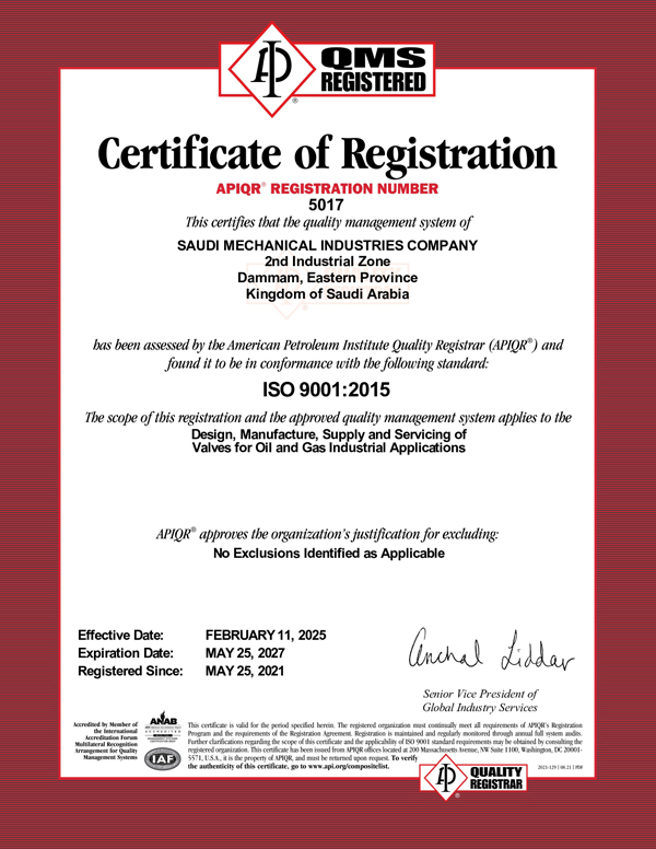 - صمامات شركة إس. إم آي المعتمدة من معهد البترول الأمريكي لأنظمة إدارة الجودة.